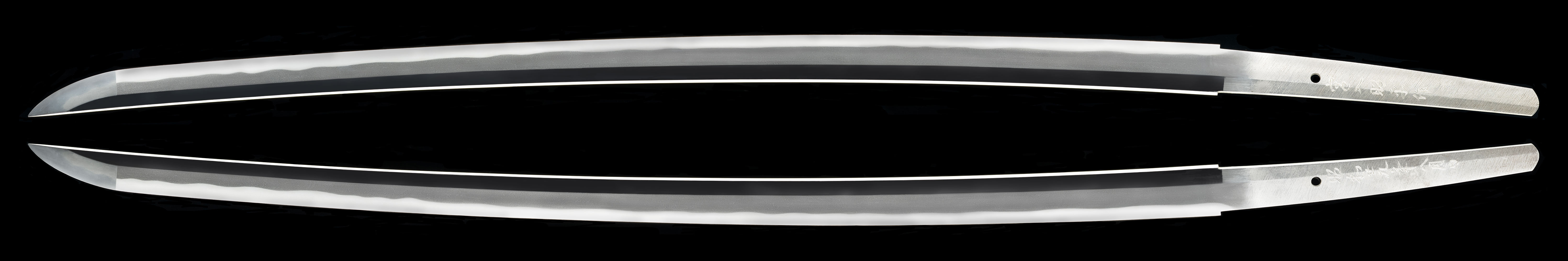 - 鎬造、庵棟、身幅広く、反りやや深く、大鋒。Shinogidukuri, Iorimune, Wide Mihaba, Slightly deep Sori, Oh-Kissaki.