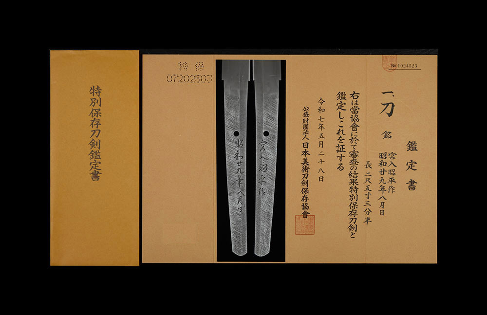 昭平刀匠は、本名を宮入堅一といい、大正2年長野県に生まれ、昭和12年栗原彦三郎の日本刀鍛錬伝習所に入門、新作日本刀展覧会、陸軍軍刀展で多くの賞を受賞。昭和27年、師栗原彦三郎の呼びかけに応じ、サンフランシスコ講和条約記念刀を制作する。昭和28年美術刀剣の作刀が可能になり文化財保護委員会より製作承認を受ける。昭和30年より昭和34年まで日本美術刀剣保存協会の作刀技術発表会で特賞を受賞、昭和35年無鑑査。昭和38年に重要無形文化財保持者(人間国宝)に認定される。昭和48年「昭平」を「行平」と改める。昭和52年64歳で没。この刀は、身幅広く、反りやや深く、先幅も広く、大鋒となる南北朝の体配で、つんだ板目肌に、杢目肌・小杢目肌交じり、地沸厚くつき、地景細かく頻りに入る古作を思わせる精良な地鉄に、小のたれに、小互の目交え、小足頻りに入り、匂口も柔らかく、匂口明るい。兼光写しの傑作である。Shohei swordsmith, whose real name is Kenichi Miyairi, was born in Nagano Prefecture in 1923. He entered Hikosaburo Kurihara's Japanese sword training training school in 1937 and won many awards at the New Japanese Sword Exhibition and the Army Gunto Exhibition. In 1952, at the request of his teacher Hikosaburo Kurihara, he produced a peace memorial sword. In 1953, he became able to create art swords and received production approval from the Cultural Properties Protection Committee. From 1955 to 1959, he received a special prize at the Japan Art Swords Preservation Association's sword-making technology presentation, and in 1960 he was unexamined. In 1963, he was certified as an Important Intangible Cultural Property Holder (Living National Treasure). In 1973, "Shohei" was changed to "Yukihira." Died in 1977 at the age of 64.